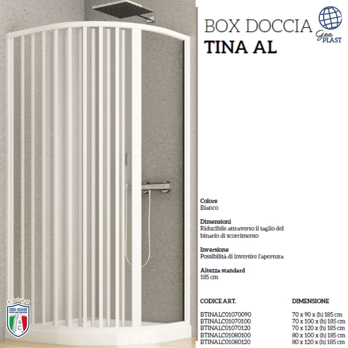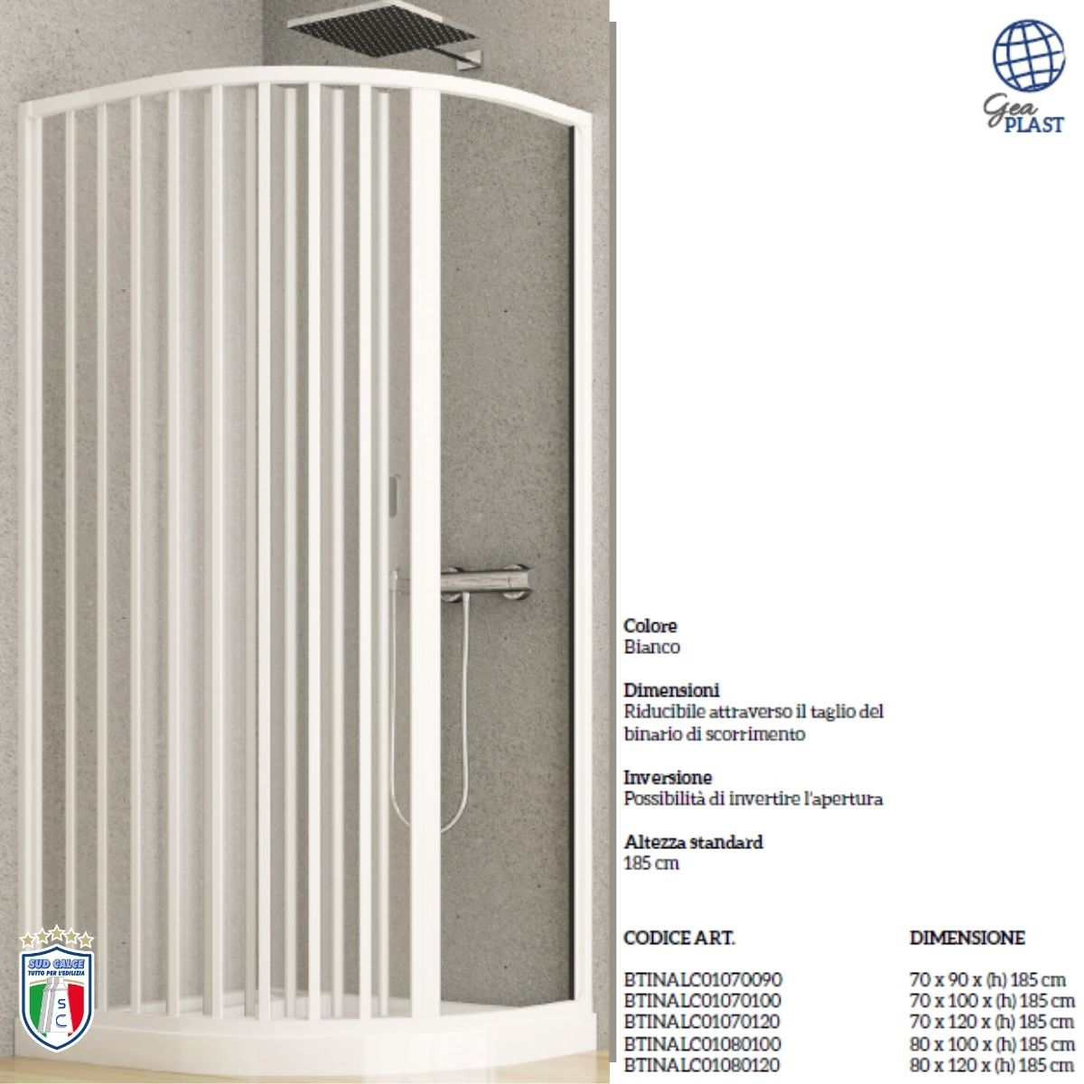 Altezza standard 185 cm (box doccia), 150 cm (box vasca). Apertura con anta a soffietto. Chiusura calamitata a tutta altezza. Maniglia a tutta altezza, integrata nel profilo della porta. Reversibile, in fase d’installazione è possibile scegliere se montarlo con entrata a destra o a sinistra.