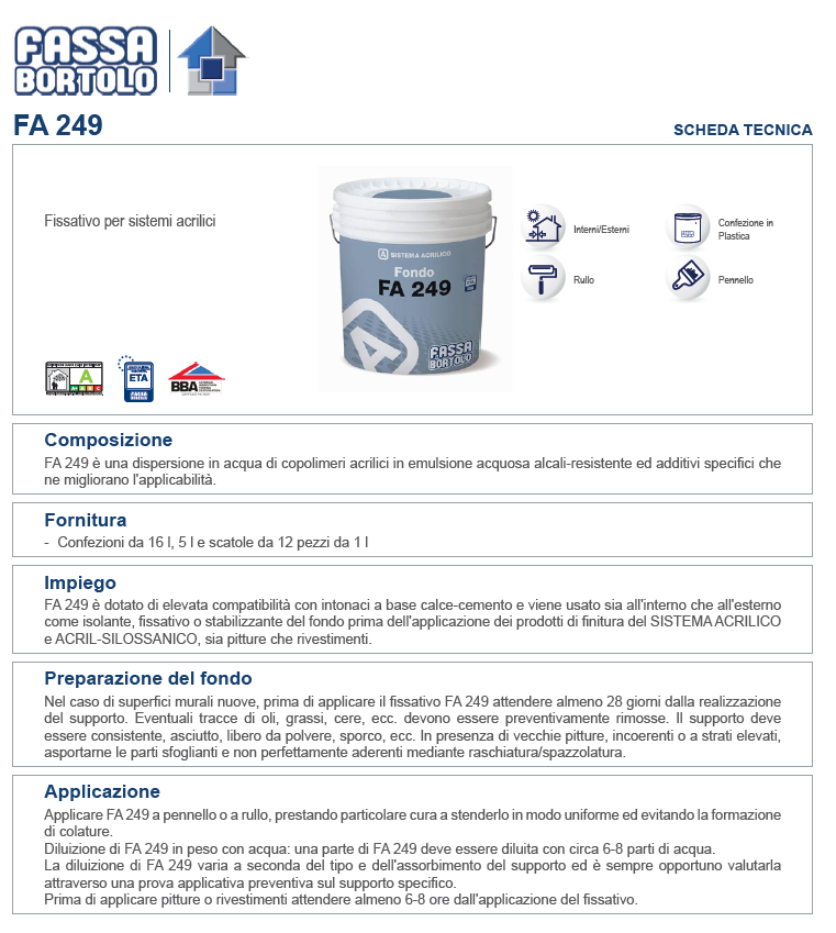 FA 249 è dotato di elevata compatibilità con intonaci a base calce-cemento e viene usato sia all’interno che all’esterno come isolante, fissativo o stabilizzante del fondo prima dell’applicazione dei prodotti di finitura del SISTEMA ACRILICO e ACRIL-SILOSSANICO, sia pitture che rivestimenti.