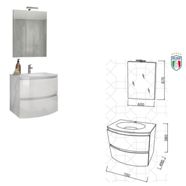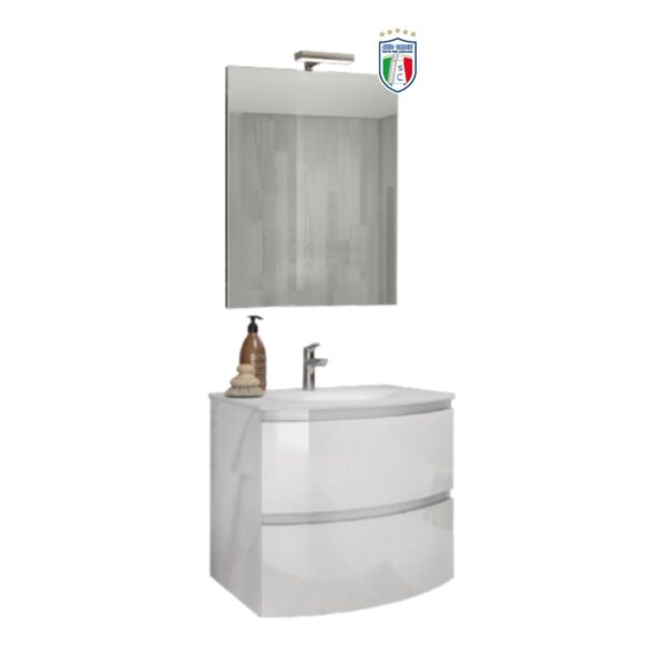 KIT composto da:  Base con 2 CASSETTONI –  Lavabo in ceramica bianco- Specchiera panoramica, applique alogeno.